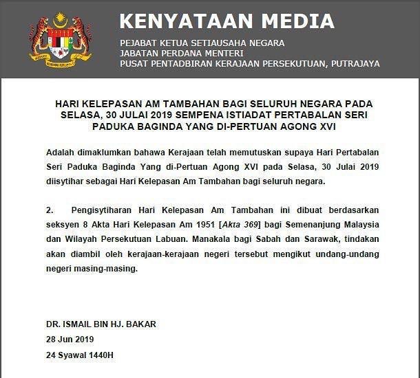 Bernama Radio On Twitter Hari Kelepasan Am Tambahan Bagi Seluruh Negara Pada Selasa 30 Julai 2019 Sempena Istiadat Pertabalan Yang Di Pertuan Agong Xvi Pejabat Ketua Setiausaha Negara Https T Co Lfstrk1yer
